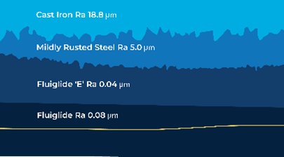 Fluiglide coatings are specially modified to provide a "low roughness amplitude". This creates an ultra-smooth surface finish that is far superior to the original cast metal and dramatically smoother than a corroded, pockmarked surface.